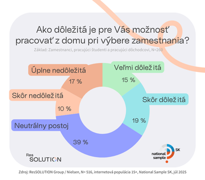 Pokiaľ ide o dôležitosť možnosti pracovať z domova, pre 15 % opýtaných je to veľmi podstatné. Ďalších 19 % ju považuje za skôr dôležitú a 39 % zaujíma neutrálny postoj. Každý desiaty pracujúci internetový Slovák možnosť home office označil za skôr nedôležitú a 17 % dokonca za úplne nepodstatnú.