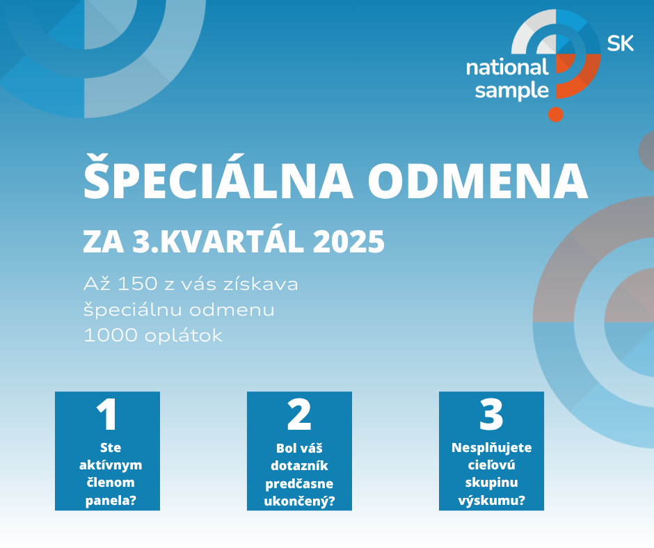 Od septembra 2023 pravidelne každé tri mesiace vyberáme 150 členov National Sample SK, ktorí získajú špeciálny bonus ako poďakovanie za svoju aktivitu. Tentokrát prinášame výsledky žrebovania za tretí štvrťrok roku 2025.